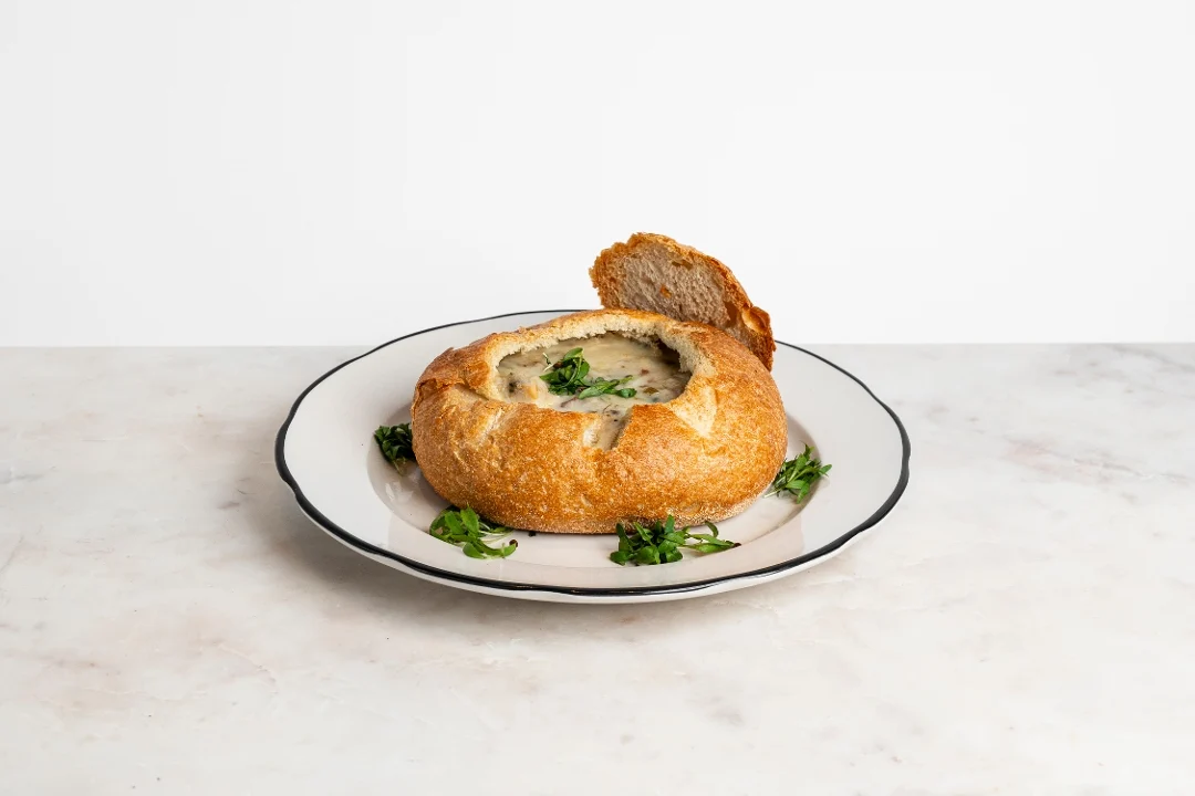 Our Clam Chowder mix, with Bacon & Coriander, served inside a Sourdough Bread.