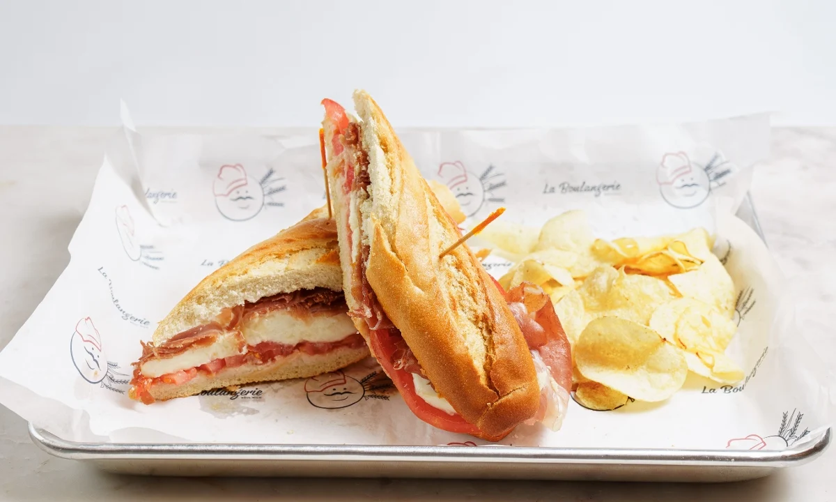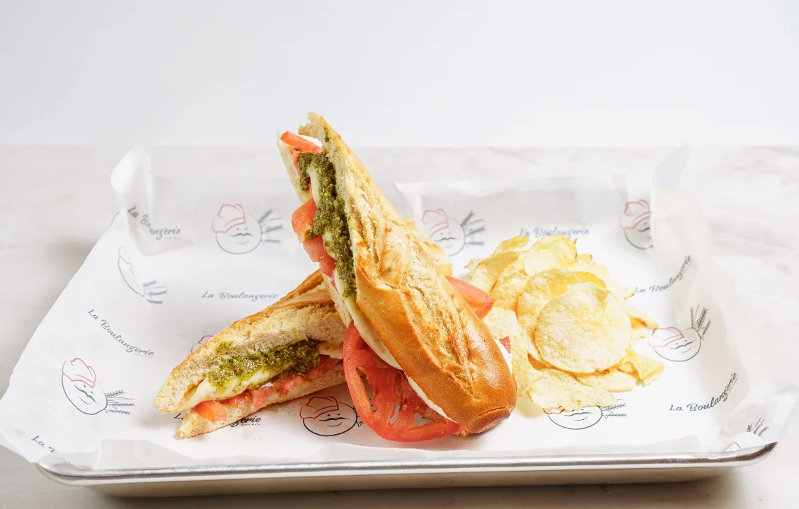 Baguette Bread with Prosciutto, Mozzarella Cheese, Tomato and Pesto.