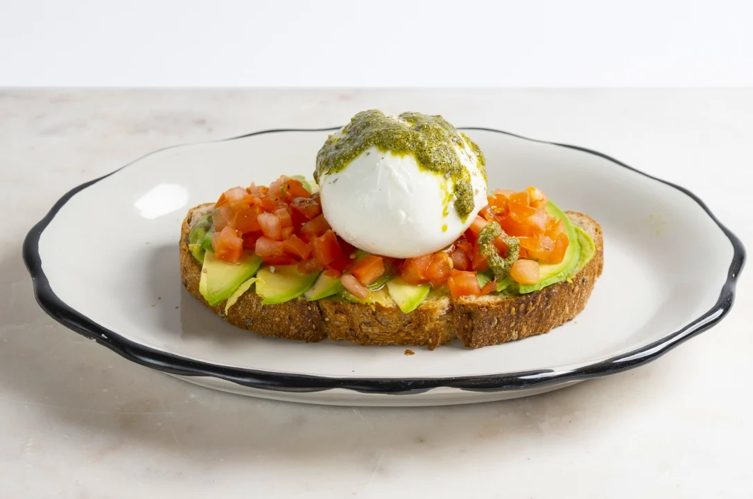 Toasted Bread, Avocado Spread, Tomato, Mozzarella Cheese drizzled with Pesto.
