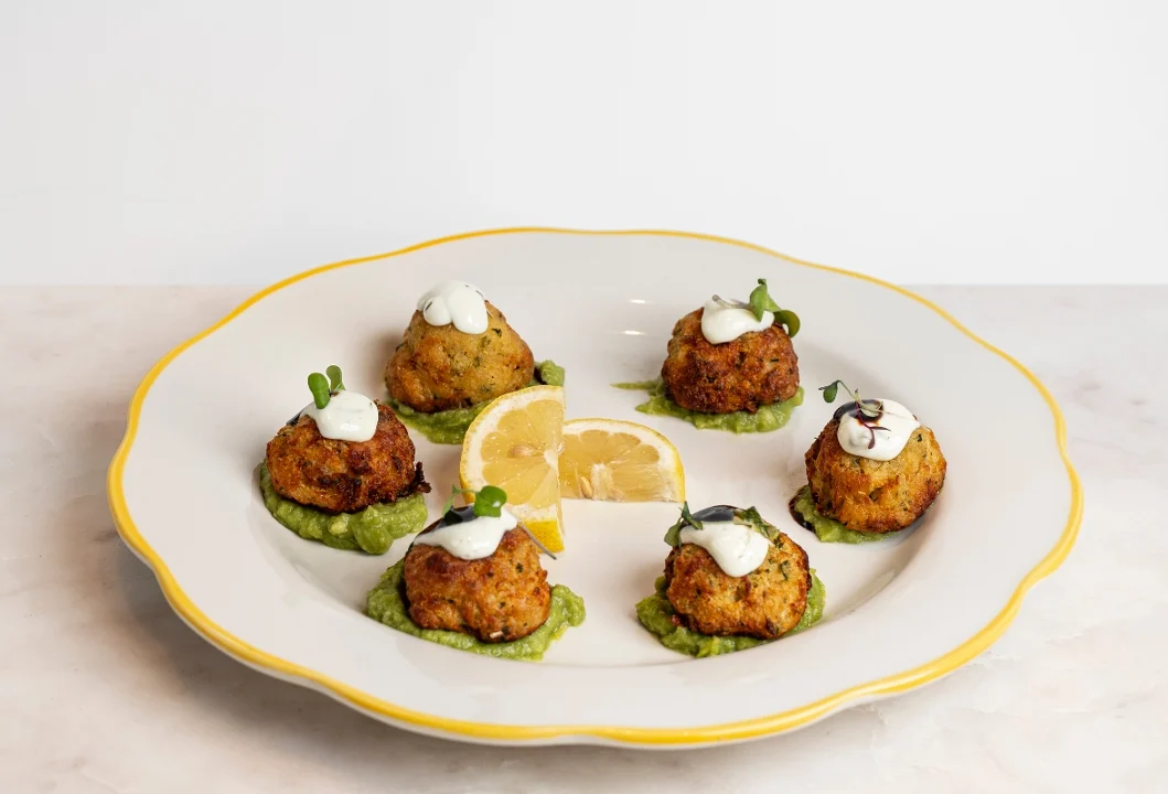 Crab Cakes over Avocado Paste, Dill Tartar Sauce, Balsamic & Lemon.