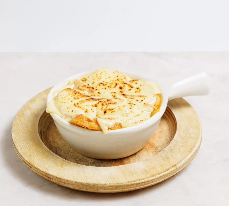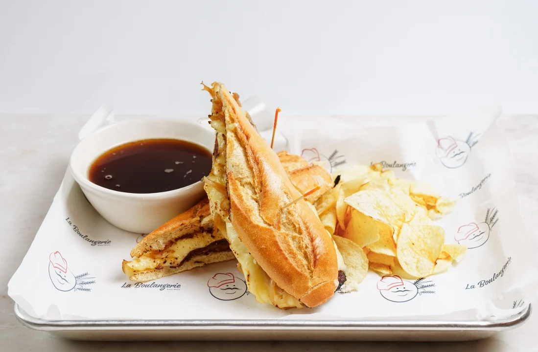 Baguette bread with Roast Beef, Melted Swiss Cheese & Caramelized Onions, with a salty "au jus" dip Sauce. (Served Hot)