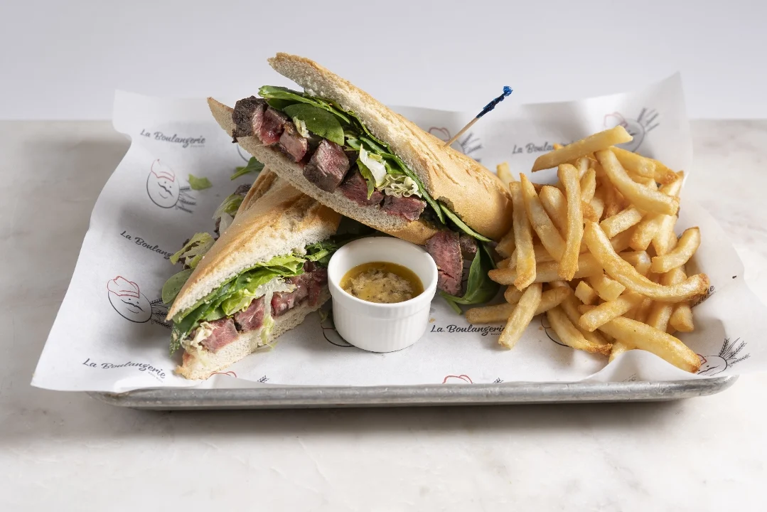 Baguette Bread, Juicy Seared Entrecôte steak topped with our Cafe de Paris Herb Butter, Spinach & Romaine Mix. With French Fries.