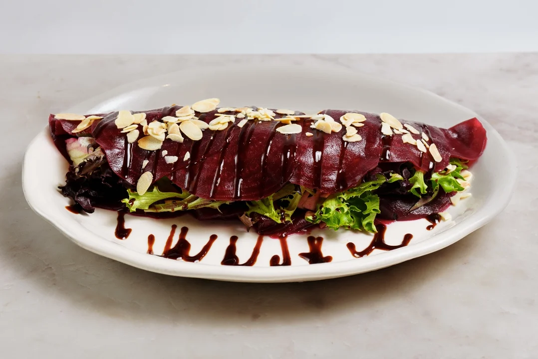 Romaine Lettuce, Goat Cheese, Apples, Roasted Almond, Beet Carpaccio with Balsamic & Olive Oil