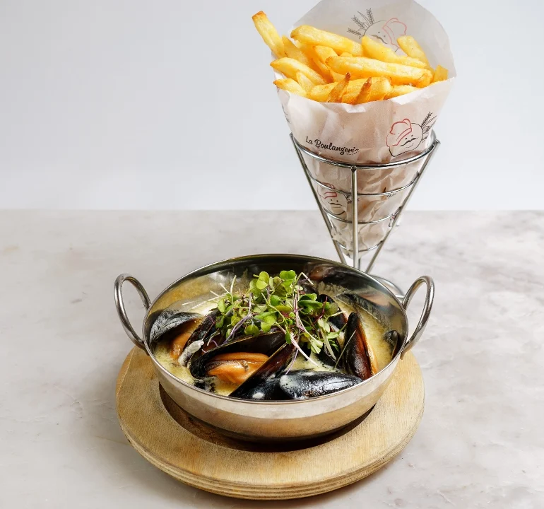 Mussels in a White Wine cream sauce, red Onions & Peppers. With French Fries.