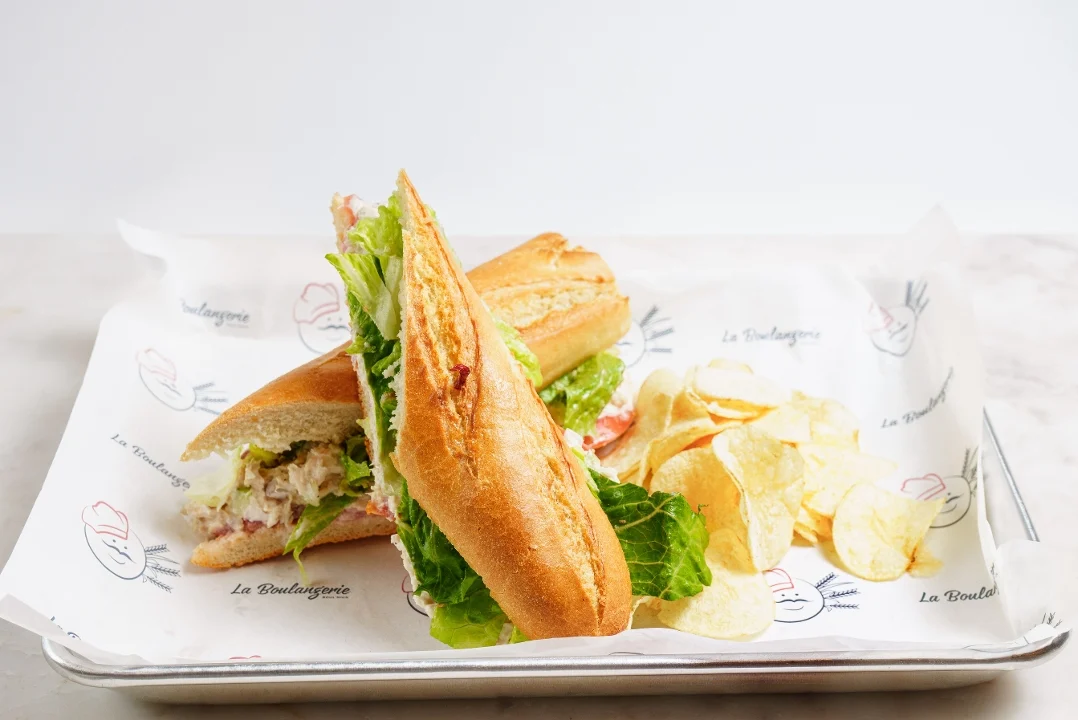Baguette Bread with Tuna Salad (Mayo, Red Onions & Celery), with Lettuce & Tomatoes.