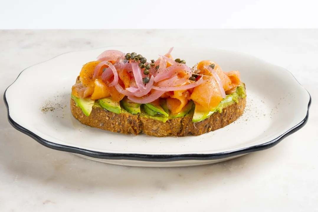 Toasted Bread, Avocado Spread, Smoked Salmon, Sautéed Red Onion and Caper Mix, Black Pepper, drizzled with Olive Oil.