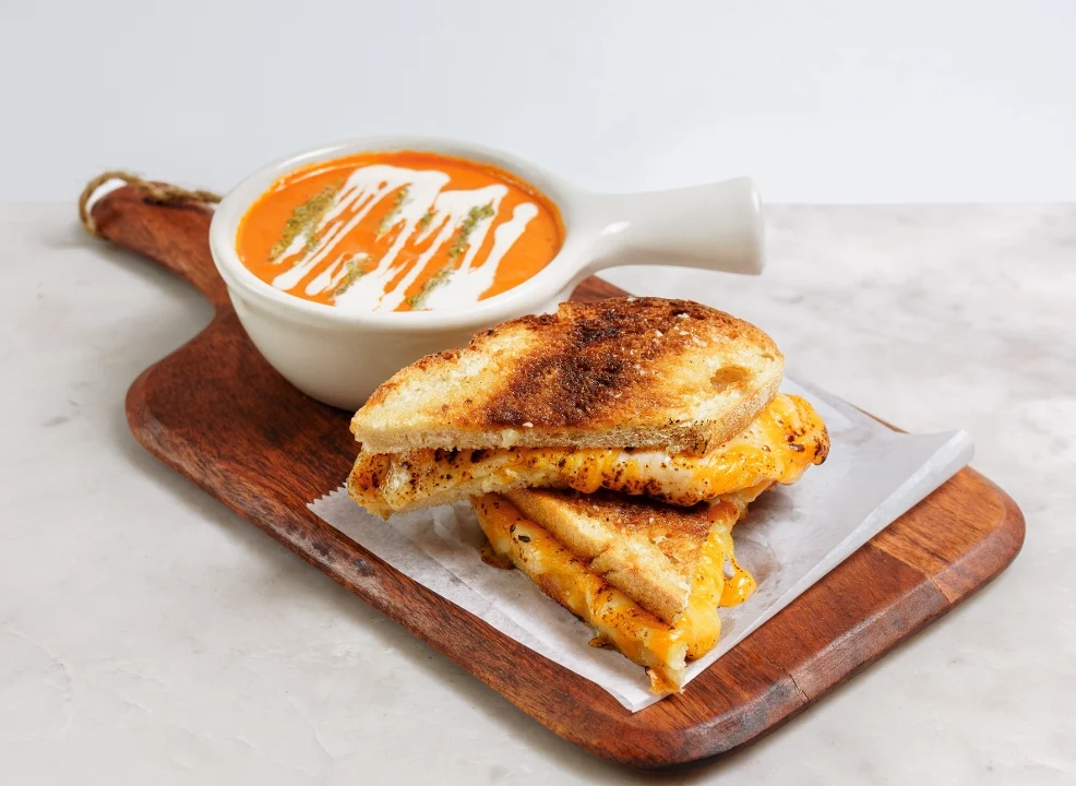 Sourdough Bread & Garlic Spread, Cheese Blend, with Tomato Soup & a dash of Pesto & Cream.