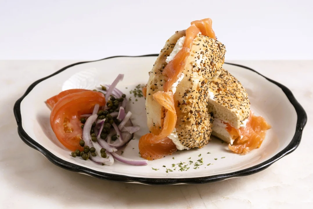 Everything Bagel, Cream Cheese, Norwegian Smoked Salmon, Red Onion, Tomato & Capers.