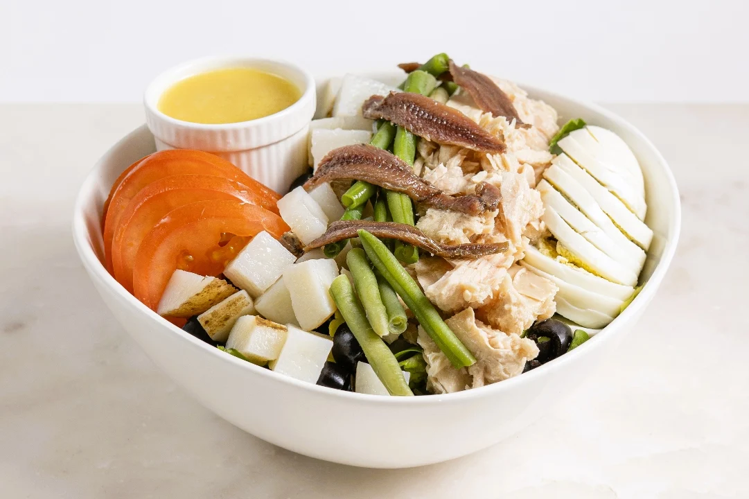Romaine, Tomato, Potatoes, Boiled Eggs, Haricot Vert, Anchovies, Black Olives, Tuna with French Dressing.