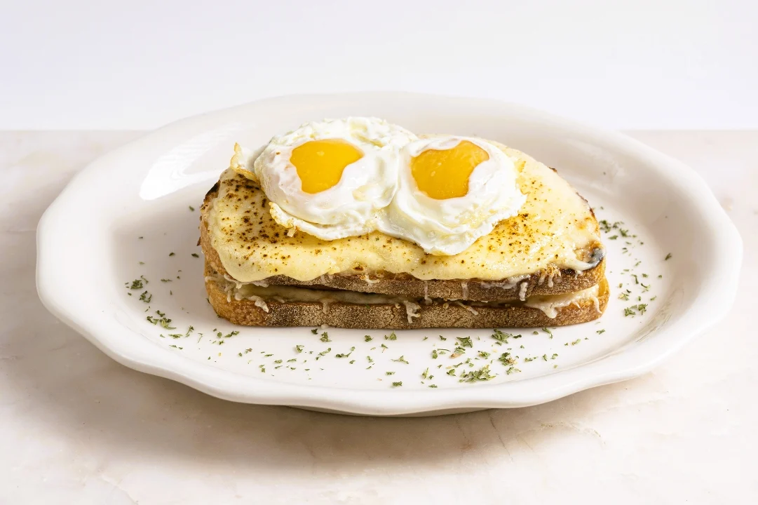 Sourdough Bread, Ham, Gruyere Cheese, two Fried Eggs with Béchamel sauce.