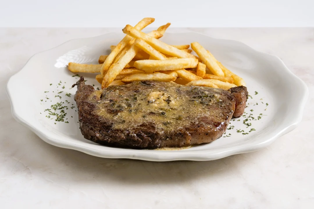 Juicy seared Entrecôte steak topped with our Café de Paris Herb Butter, served with French Fries.