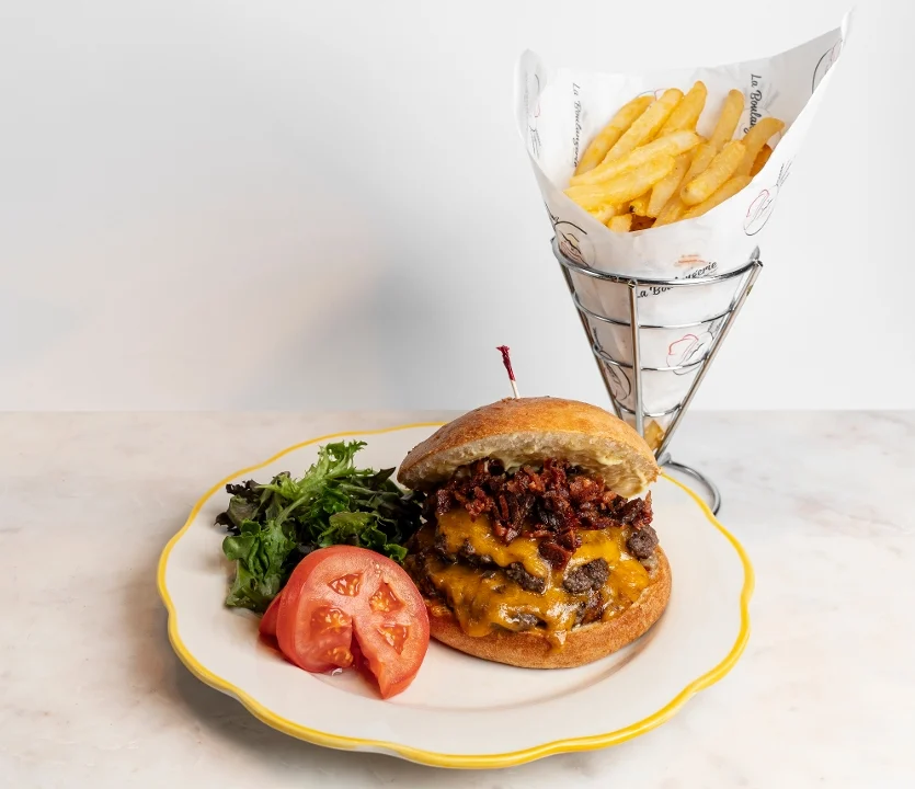 Wagyu patty Burger, Lettuce, Tomatoes, Red Onions, American Cheese, Smoked Applewood Bacon, served with French fries.