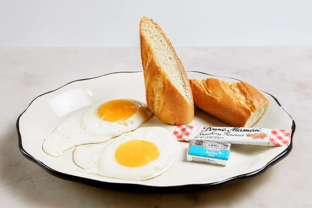 Fresh Eggs Prepared to your choice, bread, butter and jam