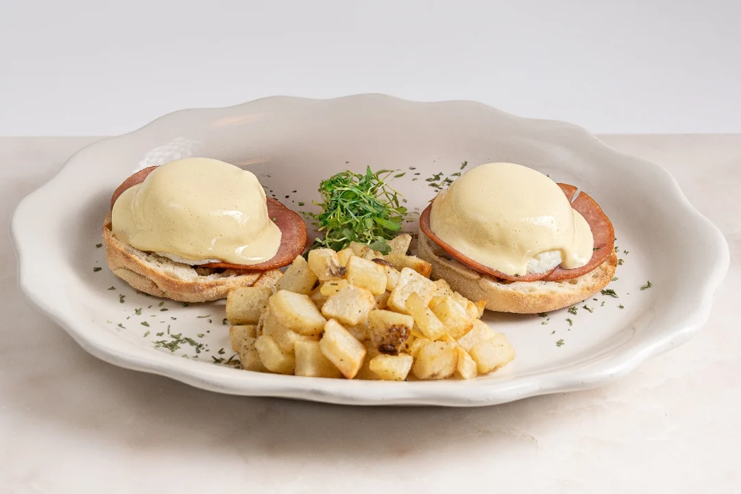 Bacon over Toasted Muffins, poached eggs, with Hollandaise Sauce. Served with Roasted Potatoes.