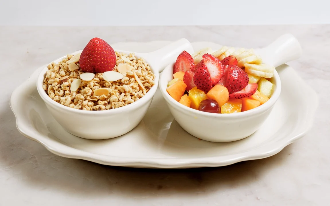 Vanilla & Almond Granola, Low-Fat yogurt with Fruit Assortment.