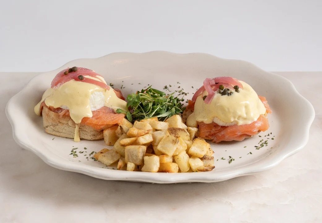 Smoked Salmon over Toasted Muffins with poached eggs & pickled onions and capers on top with Hollandaise Sauce. Served with Roasted Potatoes.