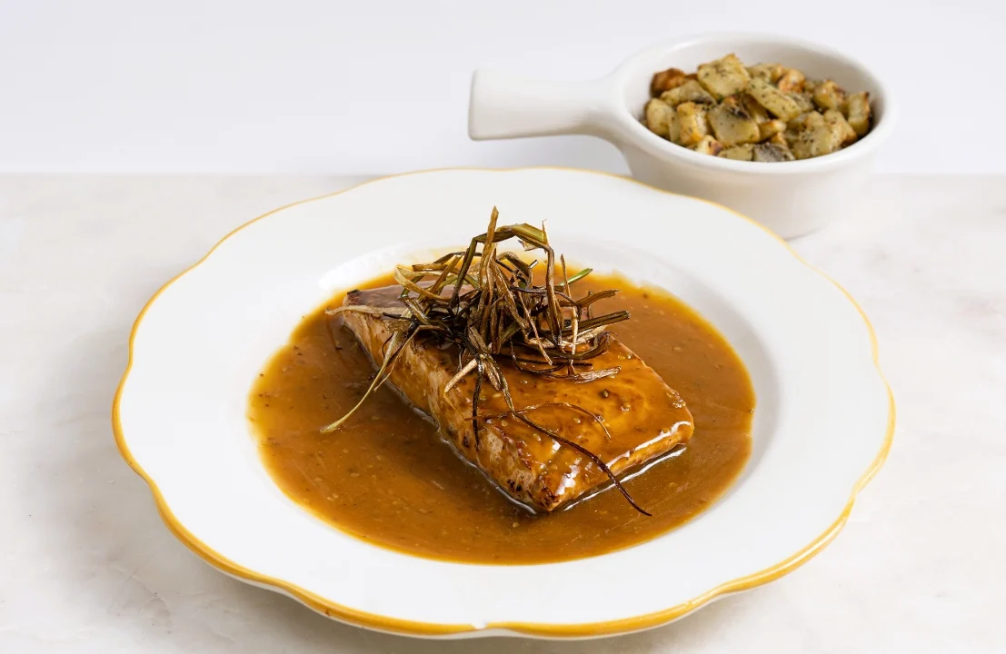 Atlantic Norwegian Salmon cooked in our Teriyaki with Orange & Sesame Sauce, served with Roasted Potatoes.