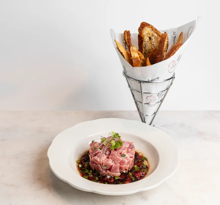 Grade A Tuna, Jalapeno Mayo, vegetables crudités with Sesame See Oil & Soy Sauce. With our Toasted Bread Chips.