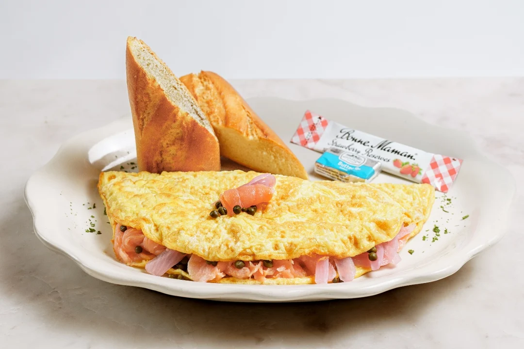 Fresh Eggs with Norwegian Smoked Salmon, Sauteéd Onions & Capers