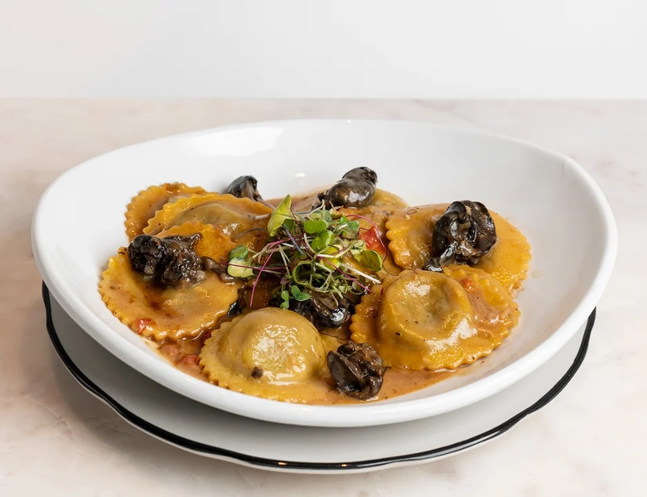 Wild Mushroom Raviolis with Escargot and a Creamy Red Wine, Soy & Leek Sauce.