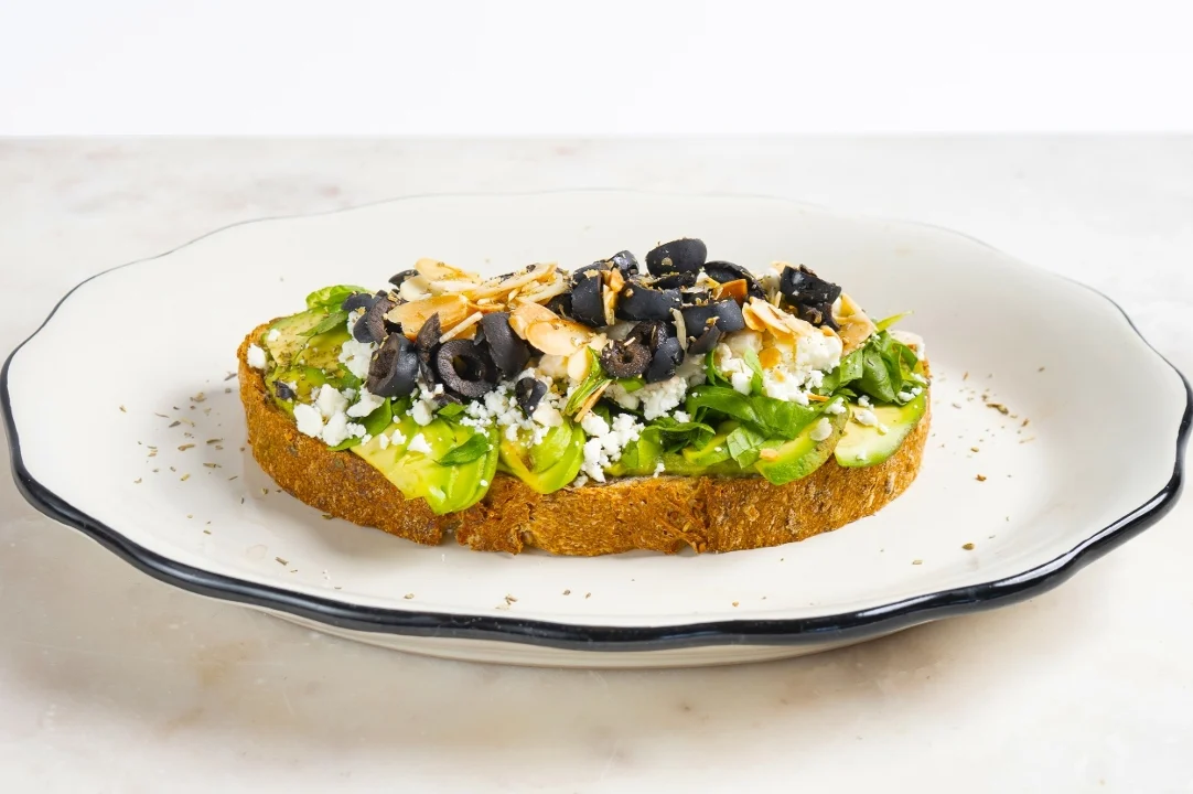 Toasted Bread, Avocado Spread, Spinach, Feta Cheese, Black Olives, Topped with Roasted Almonds, Herbs de Provence, drizzled with Olive Oil.