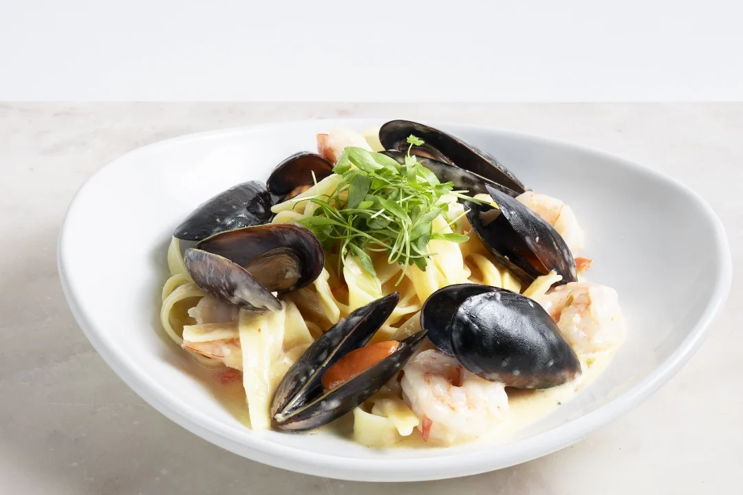 Fettuccine with Mussels & Shrimps, in a White Wine, Lemon & Green Pepper Cream Sauce.