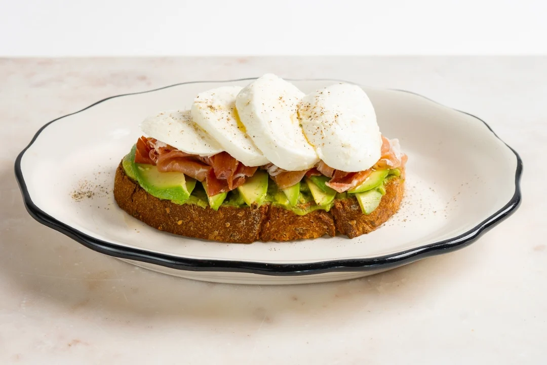 Toasted Bread, Avocado Spread, Prosciutto, Mozzarella Cheese, Black Pepper, drizzled with Olive Oil.