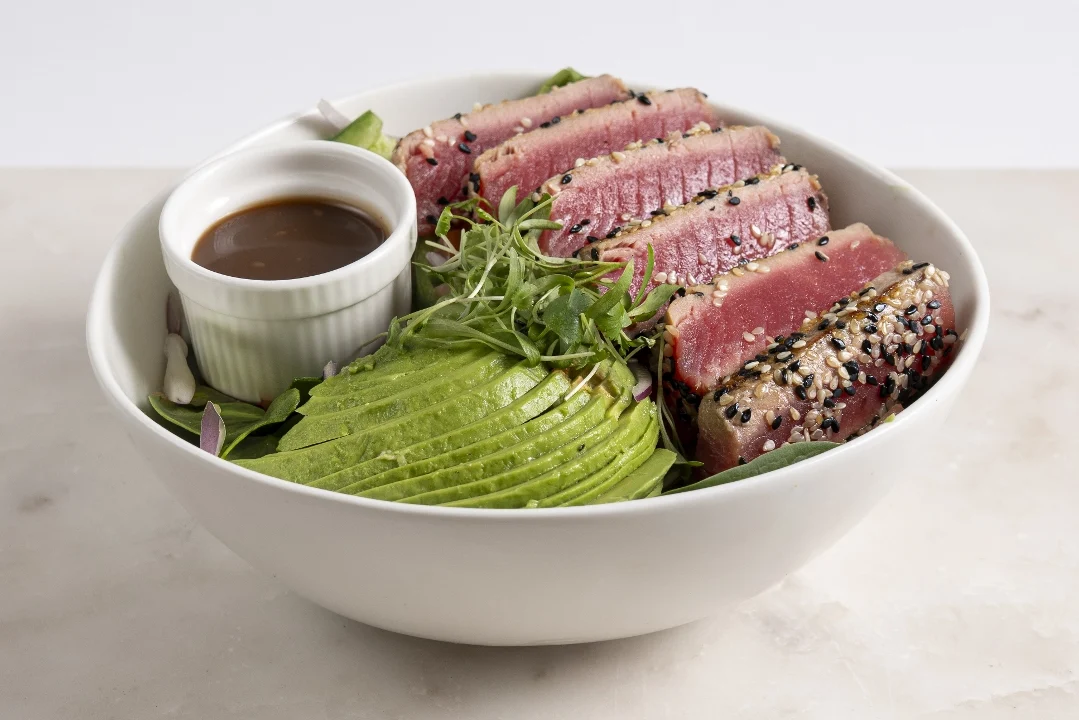 Grade A Tuna crusted with sesame seeds, seared rare, served over Romaine & Spinach with Avocado, Tomatoes, Red Onions & Green Peppers, finished with our Asian Dressing.
