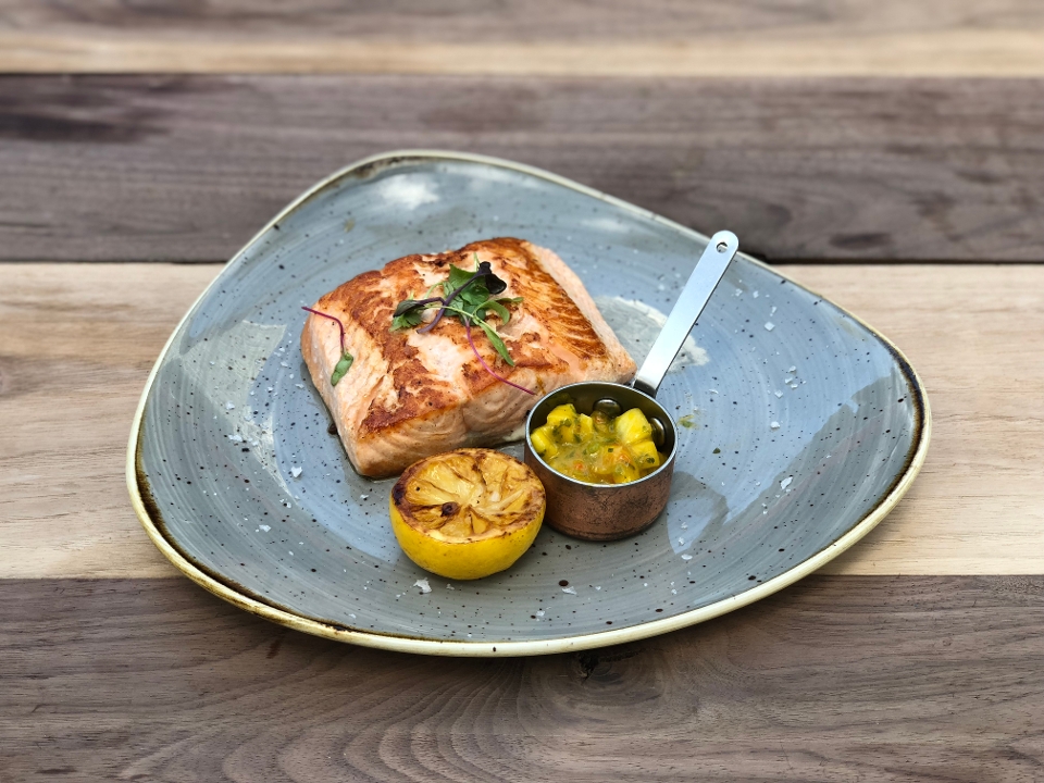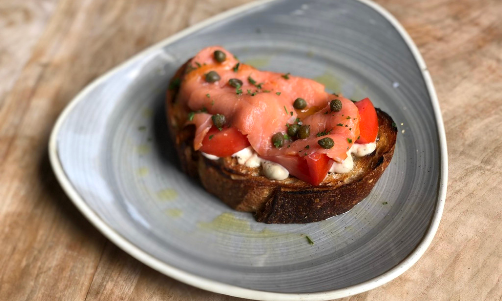 Smoked Scottish salmon, capers, smoked eggplant aioli, poached eggs, farm-style bread