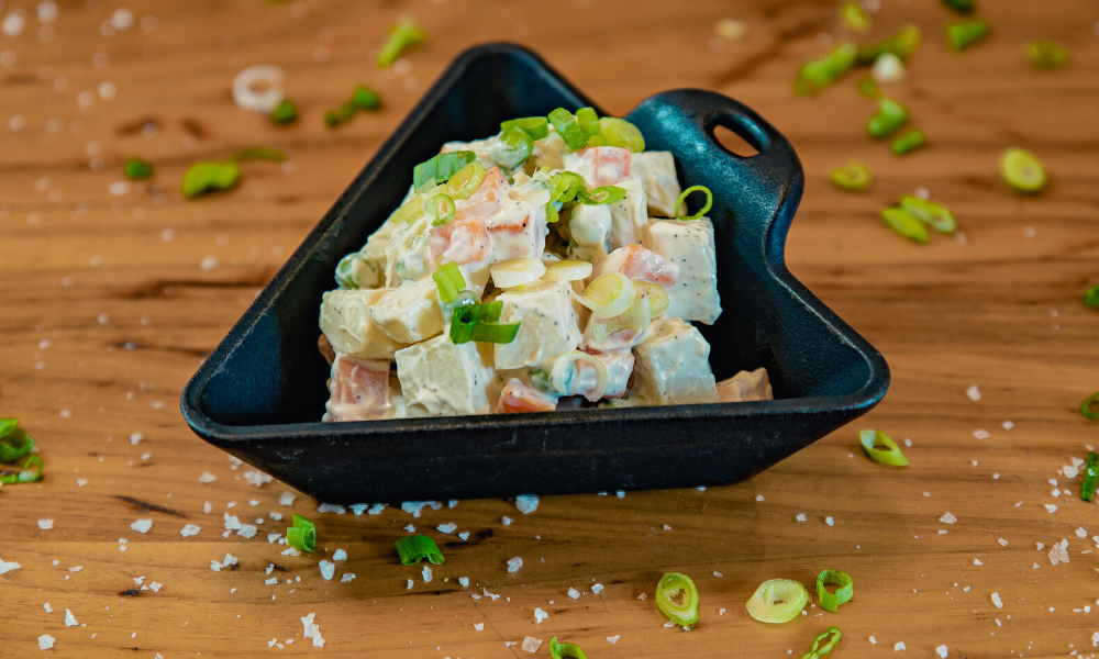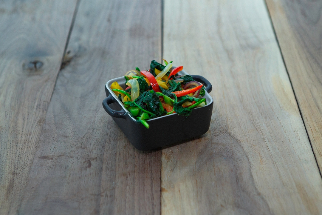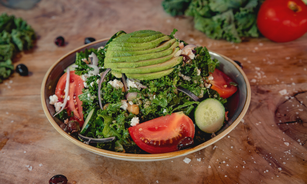 Crispy kale, tomatoes, quinoa, avocado, red onions, chick peas, feta cheese, cucumber, Kalamata olives, mango vinaigrette