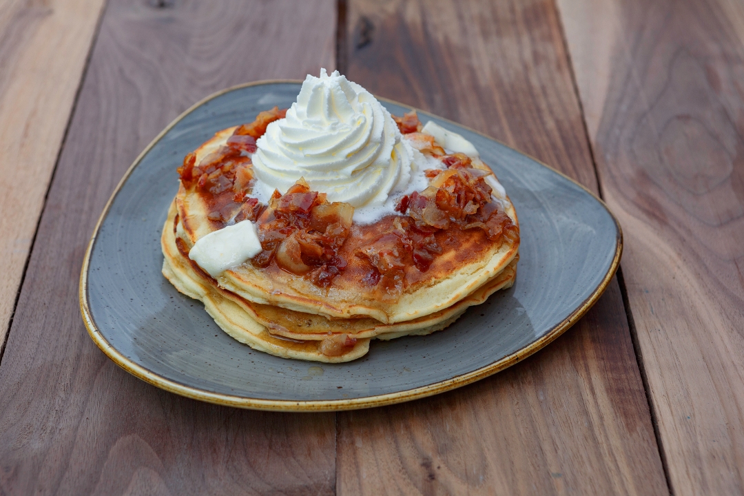 Crispy buttermilk pancakes, bacon infused maple syrup, candied bacon