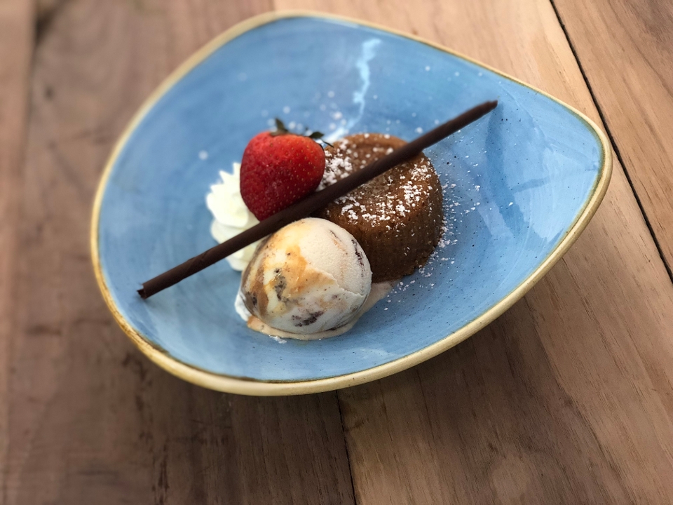 Warm chocolate truffle cake, whipped cream, chocolate ice cream