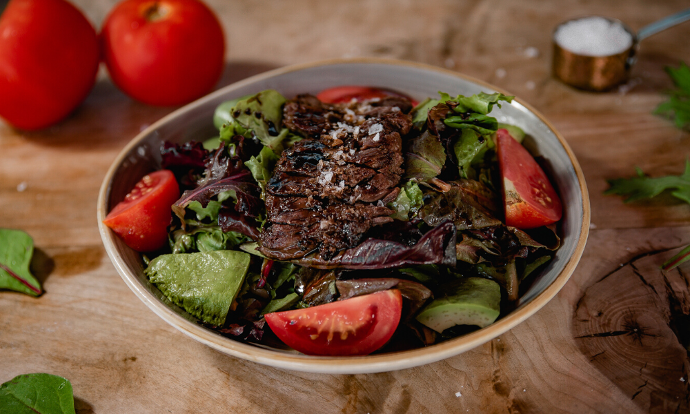 Skirt steak, mixed greens, tomatoes, avocado, crispy French fries, dijon vinaigrette, demi glace