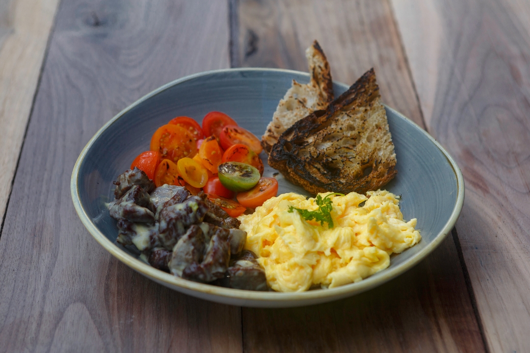 Filet mignon bites, shallot cream, fresh scrambled eggs, tomatoes, farm-style bread