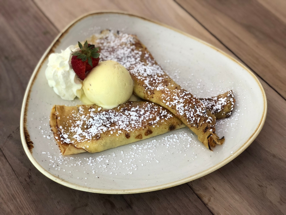 Handmade caramelized dulce de leche crepes, vanilla ice cream