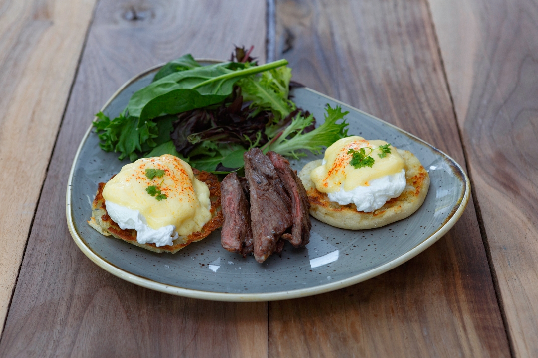 Poached eggs, hollandaise sauce, English muffin, skirt steak