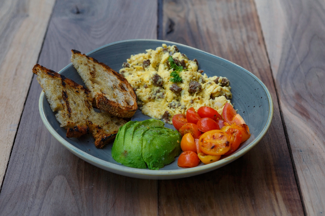 Argentinian chorizo, fresh scrambled eggs, tomatoes, sliced avocado, farm-style bread