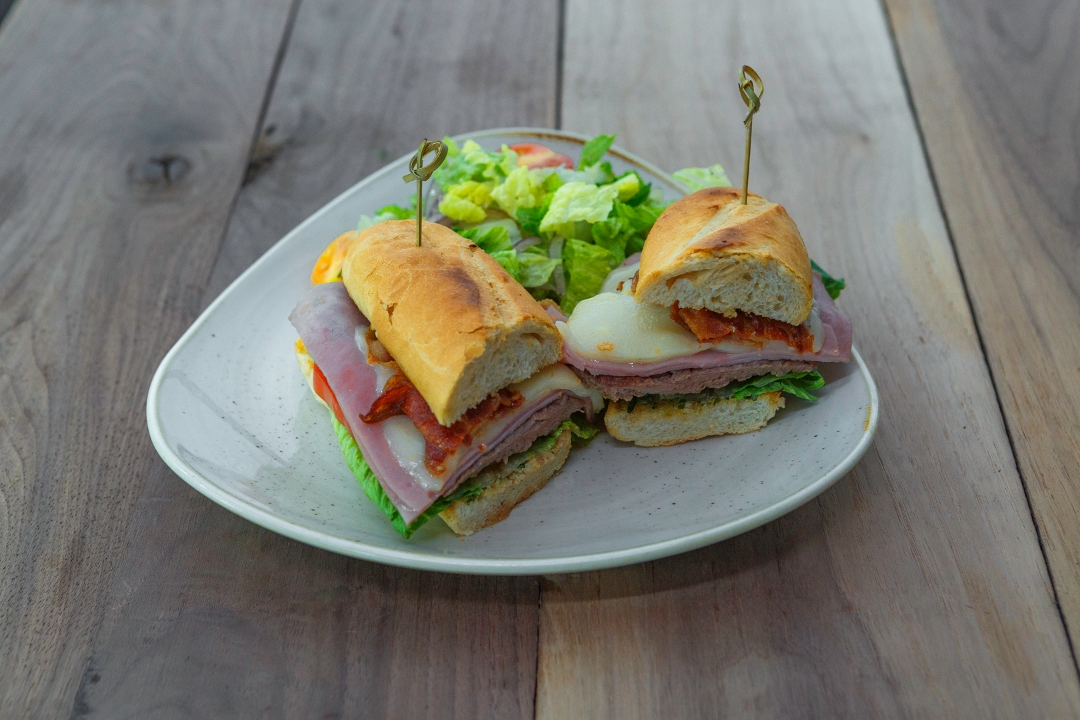 Thinly sliced filet mignon, mozzarella, ham, crispy bacon, lettuce, tomato, mayonnaise, French baguette