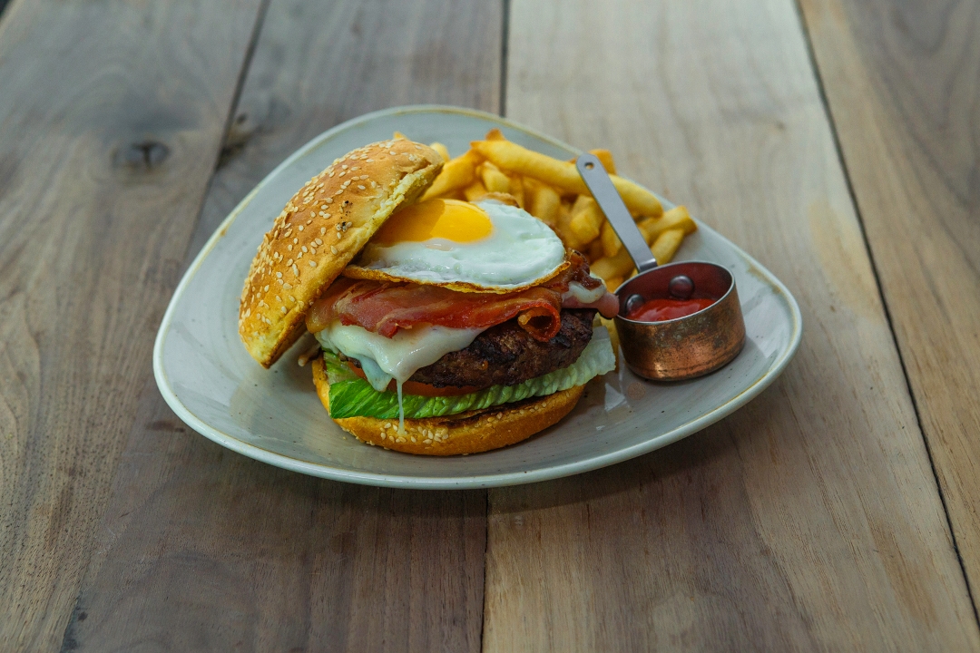 Snake River Farm American wagyu, mozzarella, ham, crispy bacon, tomato, herb aioli, fried egg, sesame brioche bun